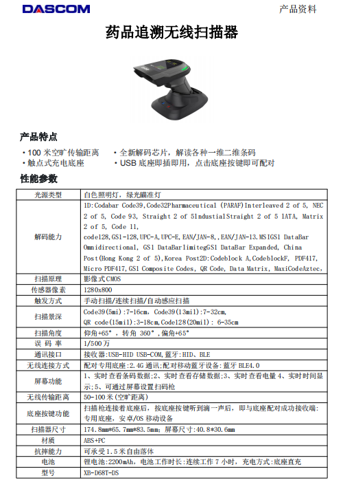 參數(shù) [品牌] 得實 [型號] XB-D68T [毛重] 1KG [產(chǎn)地] 中國 [類型] 無線掃碼器 高拍儀 [單位] 臺 [材質(zhì)] 工程塑料